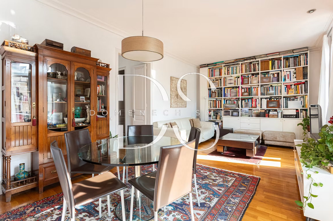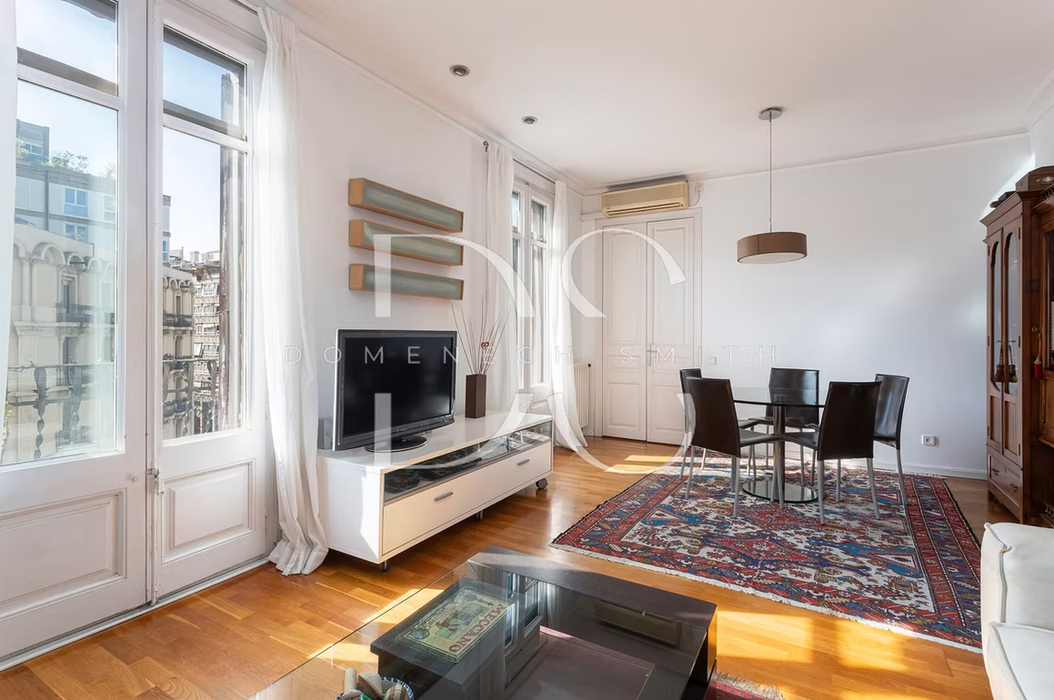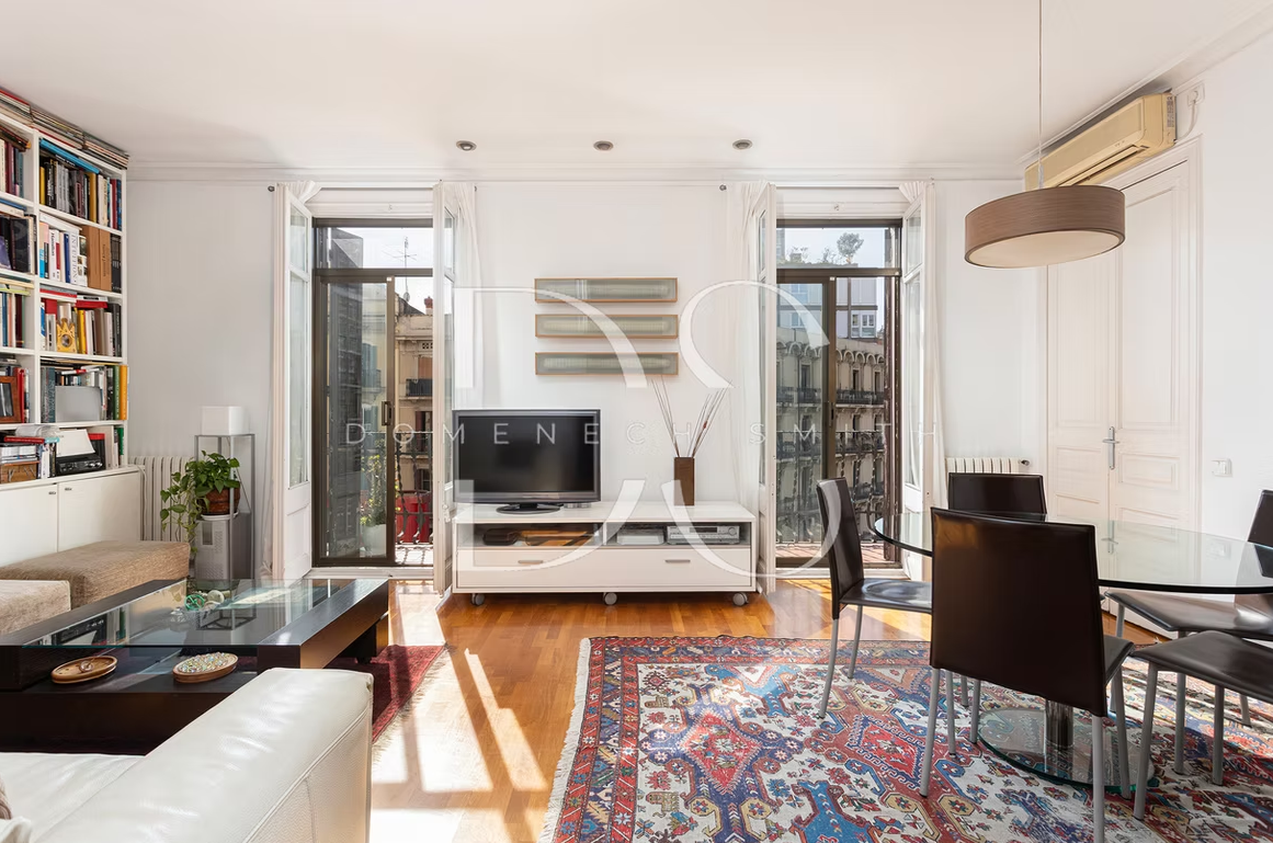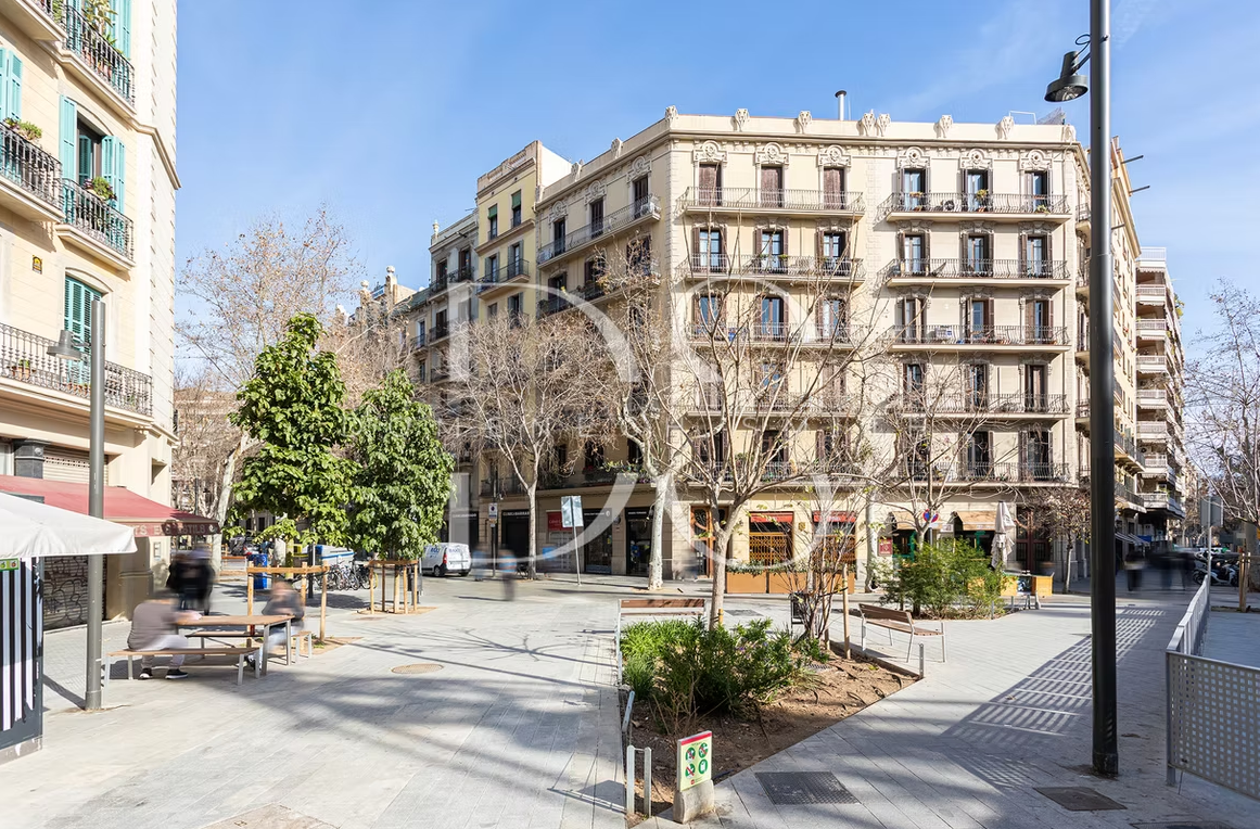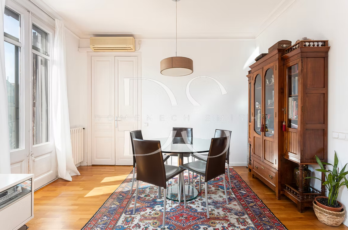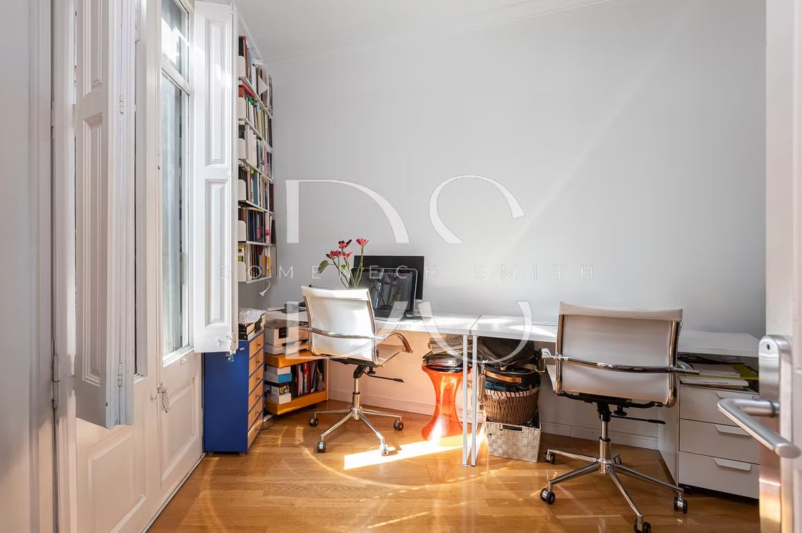 The layout of this 4-bedroom apartment is both functional and inviting, designed to maximize natural light and enhance the living experience. The main living area features a generous living room and dining room which benefits from an abundance of daylight thanks to the external positioning. Currently, the living room is divided into two sections. However, the option to remove the partition offers the potential to create an even larger, airy space. Three doors lead to a continuous balcony. A well-equipped kitchen, complete with ample storage and modern appliances, as well as an additional office space and a single bedroom, making it an ideal environment for work and relaxation. The main double bedroom is located towards the rear of the apartment and includes a “galleria” terrace typical of Barcelona architecture.