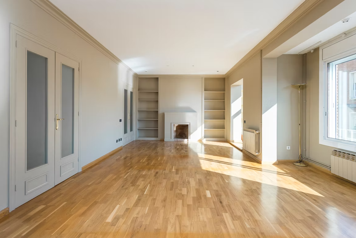 Into the apartment we find a spacious & airy exterior street-facing living area divided into three spaces with views of the tree-lined street below. Three spacious balconies extend the living space outdoors. The master bedroom exudes grandeur featuring a large marble fireplace adorned with bullfighting details. Next to the entrance there is an area for an extra guest bedroom and a guest toilet is conveniently located near the front door.