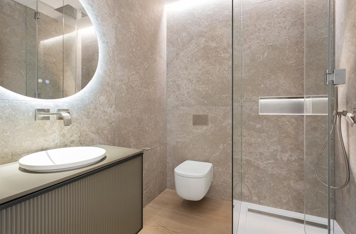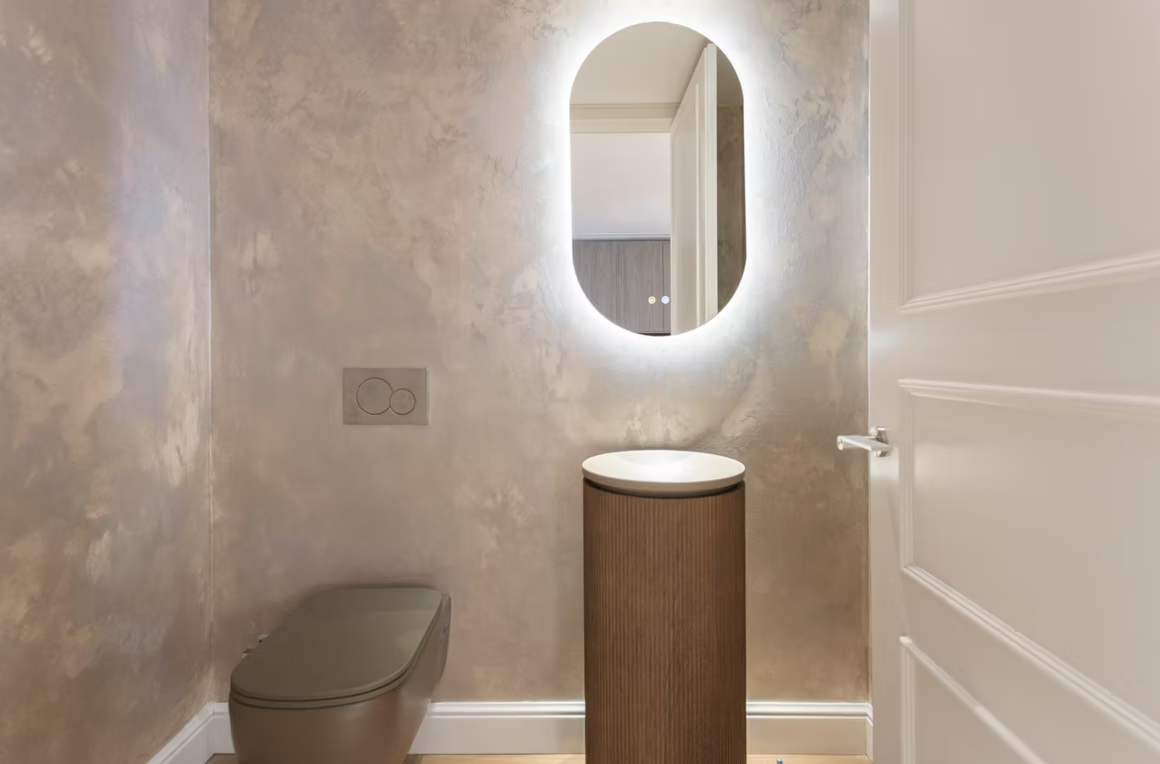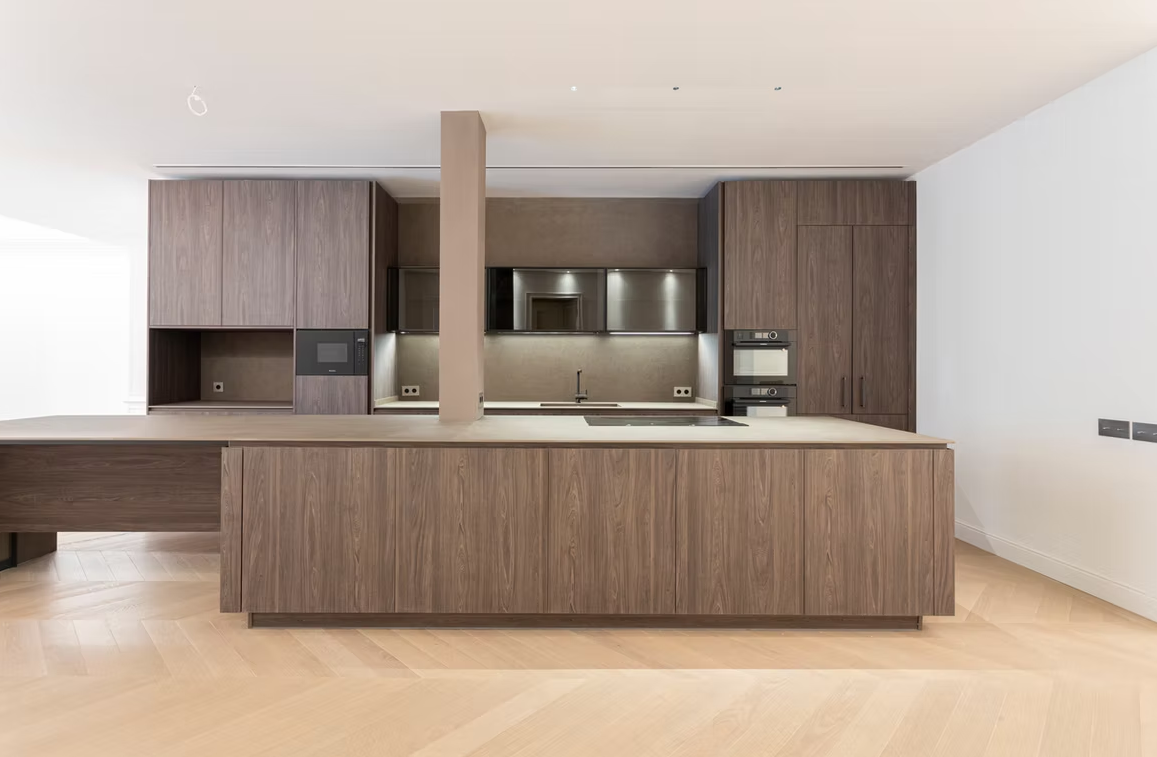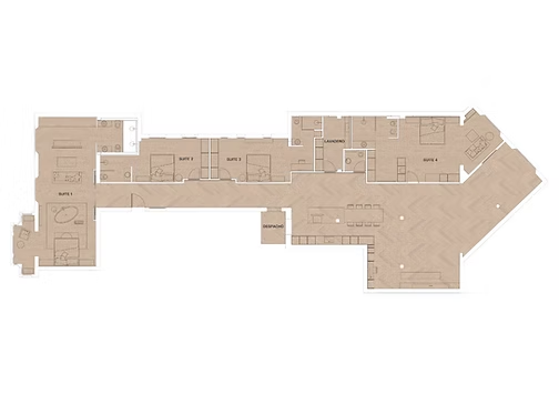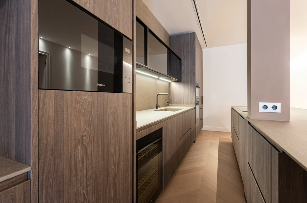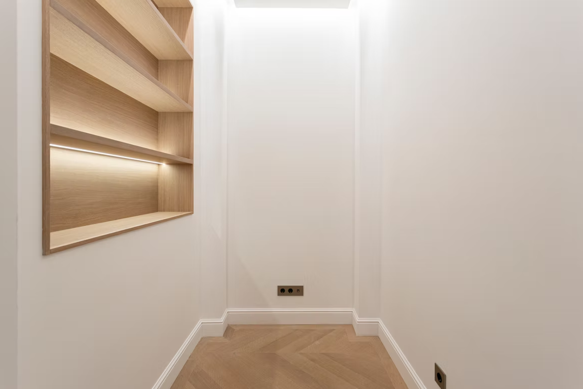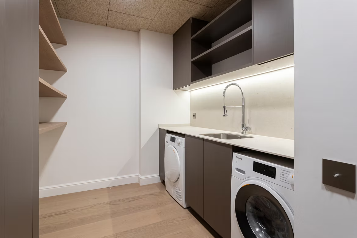 The fourth ensuite bedroom with a shower and a bathtub offers a functional layout and can be considered a second master bedroom. This room and the living area, enjoy pleasant views of historical modernist industrial buildings. The spacious laundry room equipped with Miele appliances with a separate washing machine and dryer and has been designed to provide ample storage space. An office area in the corridor provides extra functionality and storage options. Two further generously sized ensuite bedrooms are in the central part of the apartment each with full bathrooms and built-in closets from the Italian brand Inmobili. All the bathrooms are equipped with Porcelanosa and Matimex tiling, Nic Design Ovvio sanitary ware, Inbani washbasins, Lasser shower enclosures, brush nickel taps by Formma Design and Iconico.