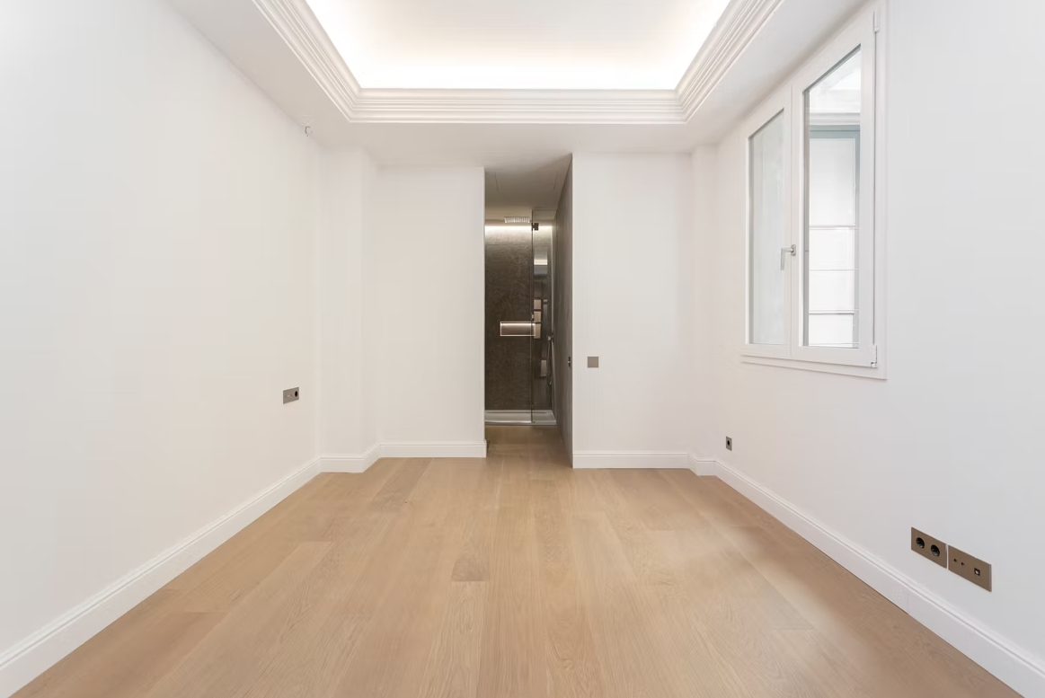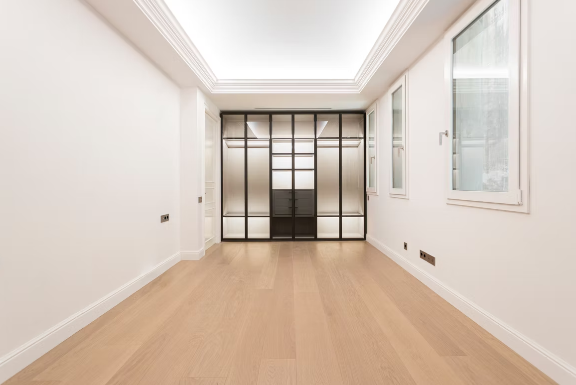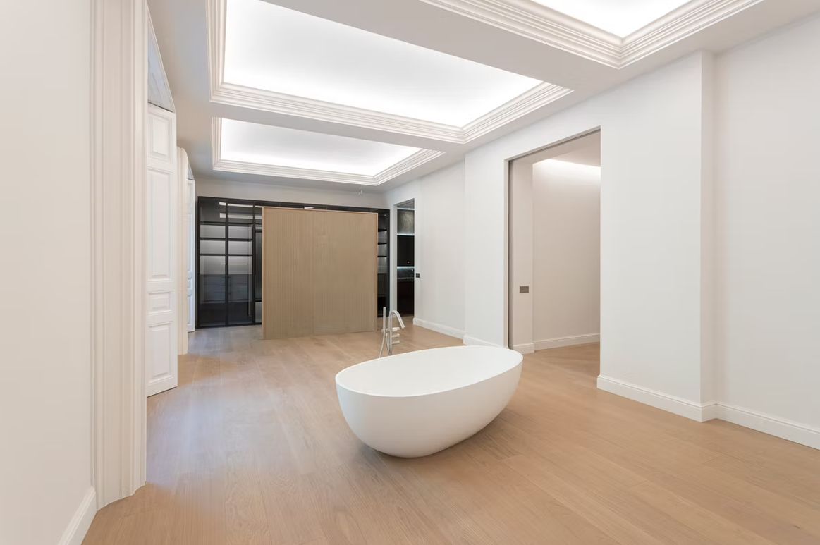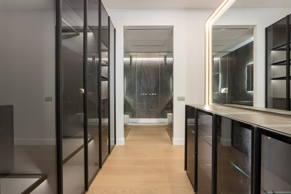 The primary master bedroom, measures approximately 60 m² and overlooks Carrer Trafalgar. The master bedroom presents an open-plan layout with a centrally positioned stylish Inbani freestanding bathtub, the sleeping area, a private sitting & television area, a dressing room with novamobili built-in closets with smocked glass and matt black profiles and a complete bathroom with two separate showers and individual water stations, bidet and WC. The entrance to the master bedroom is automatic opening by sensors through either two wooden panel doors or as an alternative two automatically electrically operated glass doors for easy access. It boasts an attractive “tribuna” enclosed balcony typical of Barcelona’s architecture and two further balconies. The master bedroom occupies the whole of the façade of the building.