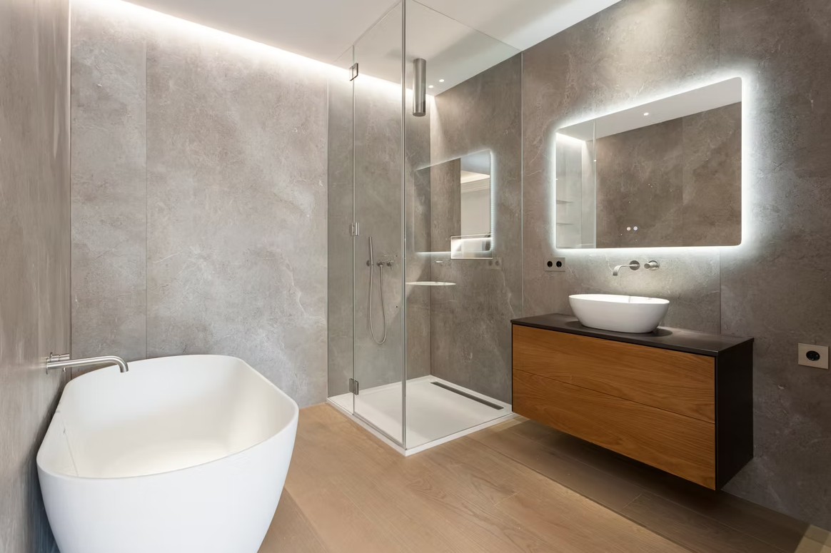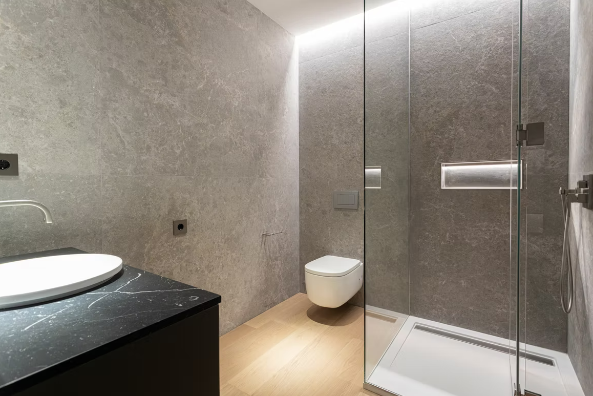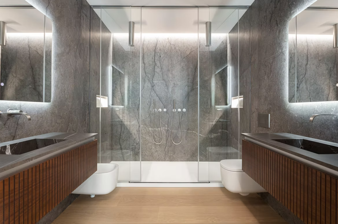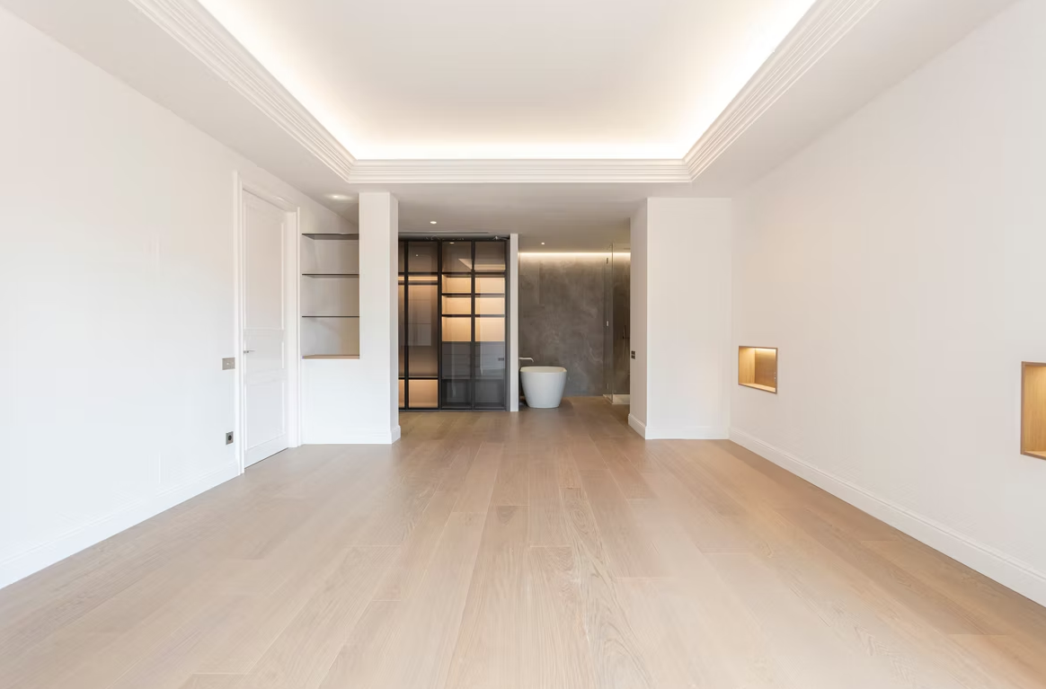 The primary master bedroom, measures approximately 60 m² and overlooks Carrer Trafalgar. The master bedroom presents an open-plan layout with a centrally positioned stylish Inbani freestanding bathtub, the sleeping area, a private sitting & television area, a dressing room with novamobili built-in closets with smocked glass and matt black profiles and a complete bathroom with two separate showers and individual water stations, bidet and WC. The entrance to the master bedroom is automatic opening by sensors through either two wooden panel doors or as an alternative two automatically electrically operated glass doors for easy access. It boasts an attractive “tribuna” enclosed balcony typical of Barcelona’s architecture and two further balconies. The master bedroom occupies the whole of the façade of the building.