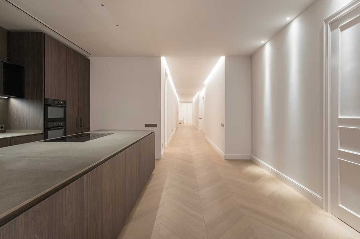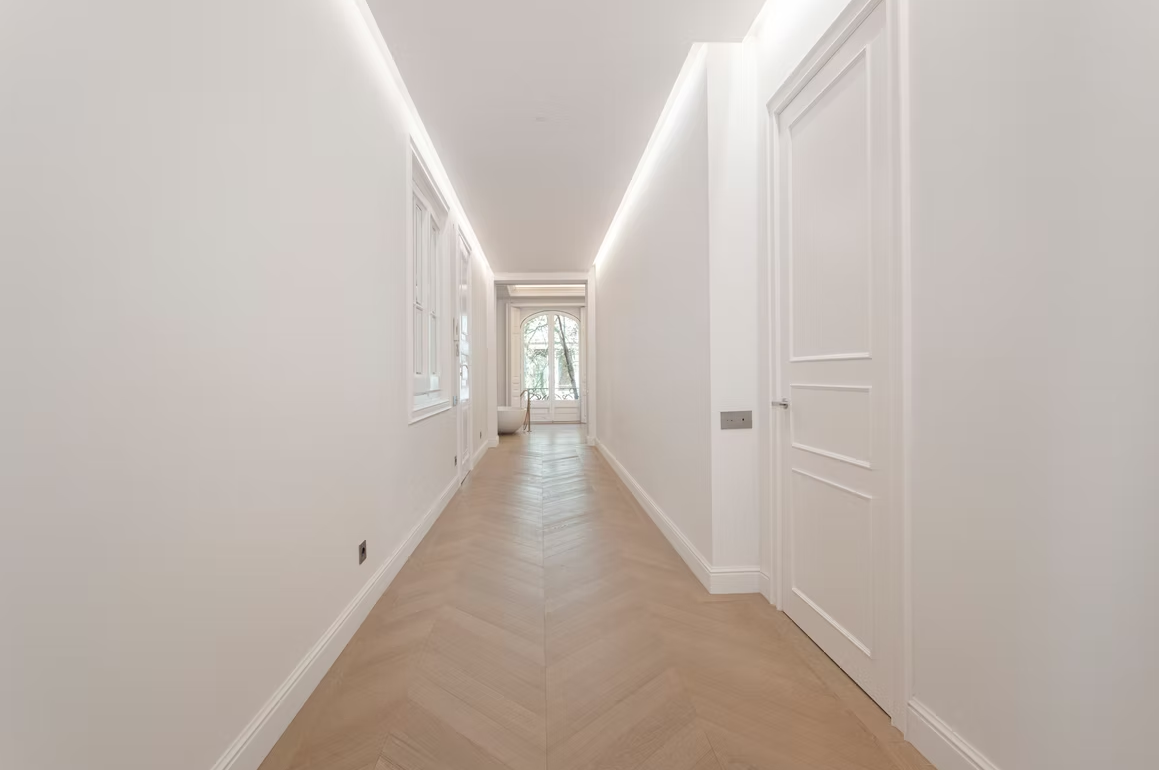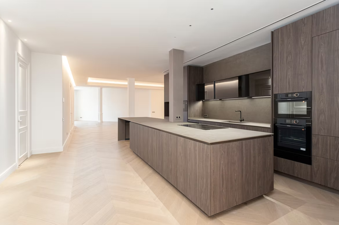 Situated on the first floor of a modernist building dating back to 1885, the apartment boasts a double spectrum from its north and south-facing orientation. Upon entering, a wide central corridor on the left leads to the 60 M2 Master Bedroom and to the right the further three bedrooms living 6 dining area facing southeast and generous kitchen on the other side of the apartment.